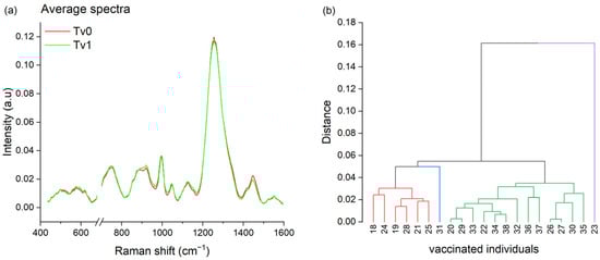 (a): Averaged SERS spectra of 21 saliva samples before (Tv0) and one month after the second dose of Pfizer vaccine (Tv1); (b) Hierarchical clustering dendrogram representing the unsupervised grouping of the SERS spectra at Tv1.