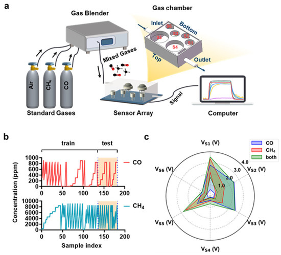 The data consist of mixed gases with varying concentrations of carbon monoxide (CO) and methane (CH4). The concentration settings for all samples are shown in Figure 1b. According to the standards by Occupational Safety and Health Administration (OSHA) and National Institute for Occupational Safety and Health (NIOSH), the concentration range of CO was set from 0 to 1000 ppm, and the concentration range of CH4 was set from 0 to 10,000 ppm. A total of 182 samples were collected, with 133 designated as training data and 49 as testing data based on collection time. These samples include the presence of only CO, only CH4, and both gases. Figure 1c shows the gas response radar chart. It can be seen that there is an overlap between the range of mixed gases and the ranges of the two individual gases, leading to difficulties in recognizing the concentration of mixed gases.