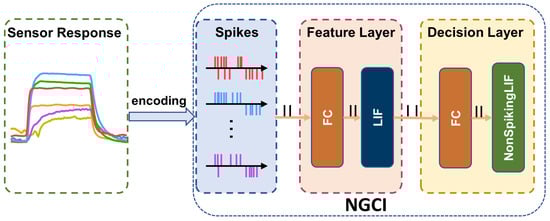 To achieve gas concentration recognition, an SNN-based model named Neural Gas Concentration Identification (NGCI) is proposed. This model employs a three-layer fully connected SNN architecture, as shown in Figure 2: the input layer consists of spike trains encoded from sensors, with neural units; the middle layer serves as a feature layer; and the final layer acts as a decision layer, with 2 neural units.