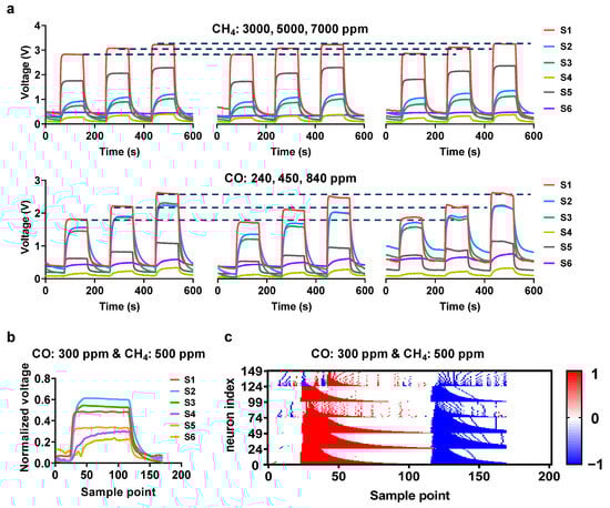 Preprocessing and encoding results. (a) Concentration gradient and repeatability tests for CH4 and CO; (b) normalized response signal of typical response signal for a sample (CO: 300 ppm and CH4: 500 ppm); (c) encoded results corresponding to (b).