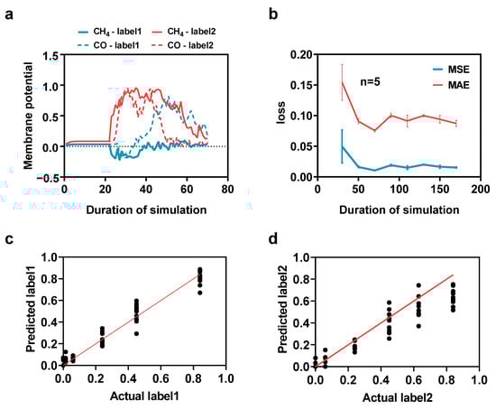 Model outputs, optimization, and recognition results. (a) Membrane potential outputs of different gas samples; (b) optimization of simulation duration; (c) recognition results for CO concentration; (d) recognition results for CH4 concentration.