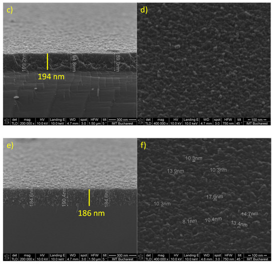 SEM cross-sectional images at different magnifications (200,000× and 400,000×) of nitrogen-doped NCG-based electrodes deposited on a silicon substrate: NNCG1 (a,b), NNCG3 (c,d) and NNCG3-diluted (e,f).