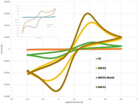 Cyclic voltammograms of 1 mM [Fe(CN)6]3−/4− in 0.1 M KCl solution on NNCG1, NNCG3, NNCG3-diluted 450 and glassy carbon (GC), with scan rate of 50 mV s−1; cyclic voltammograms of 1 mM [Fe(CN)6]3−/4− in 0.1 M KCl solution on GC (red line) and only KCl (blue line) (inset), with scan rate of 50 mV s−1.
