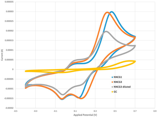 3.2. Electrochemical Behaviour of the NNCG1, NNCG3 and NNCG3-Diluted Transducers