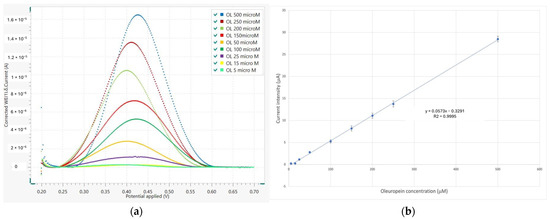 The electrochemical response of NNCG1 to oleuropein was analysed by means of SWV measurements carried out between +0.20 and +0.70 V, with a = 50 mV, f = 25 Hz and ΔEs = 2 mV in a 0.1 M KCl solution. The analytical parameters of the developed biosensor for the determination of oleuropein, namely the linear response range, sensitivity, correlation coefficient and limit of detection, are shown in Table 3. The proposed NNCG1-based electrochemical sensor showed a linear response in the range of 5.00–500.00 μM oleuropein (Figure 7).