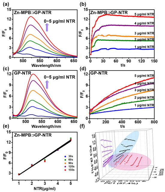 Fluorescence spectra of GP-NTR (5 μM) in response to different concentrations of NTR with Zn-MPB (5 μM) (a) or NADH (15 μM) (c). (b,d) Time-dependent intensity variation in GP-NTR (5 μM) with Zn-MPB (5 μM) or NADH (15 μM) with different concentrations of NTR (1–5 μg/mL). (e) Intensity vs. NTR levels in 5 μM Zn-MPB⊃GP-NTR at different times. (f) 3D PCA plot of 5 μM Zn-MPB⊃GP-NTR (red) and 5 μM GP-NTR (black) reaction with 1–5 μg/mL NTR in 30–100 s and their YZ plane projection (purple). 95% confidence ellipses surround each sample cluster. λex = 440 nm, λem = 520 nm.