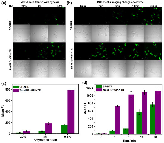 (a) Imaging of MCF-7 cells under different conditions. Cells were treated with 2 μM GP-NTR or 2 μM Zn-MPB⊃GP-NTR for 1 min after 6 h incubation under normoxic (20% O2) and different hypoxic (8% and 0.1% O2) conditions. (b) Imaging of MCF-7 cells under 0.1% O2 condition incubated with 2 μM GP-NTR or 2 μM Zn-MPB⊃GP-NTR for different times (0, 1, 5, 10, 20 min). Scale bar: 20 µm. (c) Relative fluorescence intensity of the corresponding images of MCF-7 cells after being incubated with 2 μM GP-NTR or 2 μM Zn-MPB⊃GP-NTR under different oxygen contents for 1 min. (d) Relative fluorescence intensity of the corresponding images of MCF-7 cells at varied time points after being incubated with 2 μM GP-NTR or 2 μM Zn-MPB⊃GP-NTR under hypoxia conditions. The results were presented as mean ± SE with replicates, n = 3.