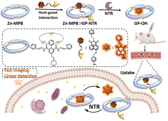Supramolecular systems based on host–guest interactions have been evolving immensely in recent years, and they are widely used in various biomedical applications, such as biological imaging, clinical medicine, and drug delivery due to the functional modification features and dynamic properties of host−guest self-assembly [24]. Well-known macrocyclic molecules such as cyclodextrins, crown ethers, calixarenes, and pillararenes have been established as ‘hosts’ to accommodate ‘guests’ inside their cavities through noncovalent interactions to construct host–guest complexes [25]. Metal–organic capsules have attracted extensive attention due to their adjustable cavity and characteristics of easy assembly and could solve the problem of difficult covalent modification [26,27]. A metal–organic capsule incorporated by the active site of NADH and its mimics has been postulated to be an effective host molecule for constructing an artificial catalytic platform, and it could emulate the environment of an enzyme pocket that changes the reactivity of the substrate and achieves a significant increase in the reaction rate [28,29,30]. The host–guest platform consists of a cofactor-modified metal–organic capsule and a substrate through intermolecular interactions, featuring the advantages of strong contact, stimulus response and dynamic characteristics. This platform provides a simple and effective approach for the detection of NTR, which could enable the redox reaction between the substrate, cofactor, and enzyme to occur effectively. When the host–guest platform interacts with NTR, it enables the efficient proton/electron transport of the biological microenvironment, eliminates the diffusion of cofactors during the process, and accelerates the detection efficiency of NTR.