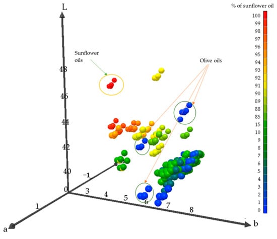 3D presentation of the color space (L, a, and b) for sunflower and olive oils (in a pure form, as well as mixed (1–15%, 85–99% of added sunflower oil in olive oils)).
