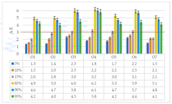The industrial produced olive oil samples and those produced by small producers differ in color (Figure 1); however, there is a visible change in the color parameters depending on the dilution of the olive oil. There is a visible change in the color parameters depending on the dilution of the olive oil, and the Δ E parameter is an indicator when these changes are visible to the naked eye. Therefore, the differences in color parameters from the standard oil are presented in Figure 2, according the Equation (1). In the case of the dilution of olive oil, in the range of 1–15% with sunflower oil, the standard color parameters were from the olive oils, while in the case of adding 85–99% sunflower oil in the olive oils, the standard color parameters of sunflower oil were used.
