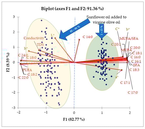 Sunflower is dominated by three saturated fatty acids (C 18:0, C 22:0, C 24:0) and doubly unsaturated linoleic acid (C 18:2), which makes up the largest proportion of fatty acids in this oil. These four fatty acids in the graphs are located opposite the sample of undiluted olive oil, which means that they have the lowest values in that sample. Such results coincide with the results of Škevin et al. [36], who concluded in their work that sunflower oil has a significantly higher proportion of linoleic acid in its composition than olive oil and that the addition of 1% of sunflower oil to extra virgin olive oil will significantly change the proportion of linoleic fatty acid. Saturated fatty acids with chains of 6 to 14 carbon atoms are not found in the tested oils. According to Downey et al. [37], oleic fatty acid shows maximum absorption in the region of wavelengths around 1725 nm. Linolenic fatty acid (C 18:3), although it makes up a very small proportion of the total fatty acids in olive oil, dominates in it and not in sunflower oil. This was also proven in the research by Christopoulou et al. [38], who concluded that therefore the adulteration of olive oil with sunflower cannot be detected by determining the mentioned fatty acid. Bearing in mind the structure of fatty acids and chemical bonds, such as –CH3; –CH2; = CH2; C-H; and CH=CH, it is certainly more than justified to use NIR spectroscopy, which records the absorbance bands at the molecular level [39,40]. Medium-chain fatty acids were not detected (observed were C 6:0 (caproic acid); C 8:0 (enanthic acid); C 10:0 (capric acid); C 12:0 (lauric acid)). In the list of long-chain Fas, significant differences for the virgin olive oils and sunflower oil were determined. Observing the saturated FA, the palmitic acid (C 16:0) is five times higher in the olive oil vs sunflower oil, while the heptadecanoic acid (C 17:0) is not determined in sunflower oil, but it is in olive oil. Monounsaturated fatty acids show significant differences for the determined oleic acid, which is the dominant one in the olive oil (76.8%), and their sum is 2.5 times higher in olive oil (78.2%) compared to sunflower oil (31.7%). The opposite relationship was found for PUFAs; sunflower oil contains almost 10 times more fatty acids from this group (56.3% vs. 5.7% in olive oil). The main donor to that share is linoleic acid (C 18:2), which is dominant in sunflower oil (56.2%). The ratio of monounsaturated fatty acids to saturated (MUFA/SFA) favors olive oil and is almost twice as high (5.08 vs. 2.62 for sunflower oil). Now, it is clear that the fatty acids can be a valuable indicator of adulteration. This was also confirmed by the use of principal component analysis (PCA) used to investigate the potential grouping of samples based on the fatty acid composition and color parameters for adulterated oil samples (Figure 3).