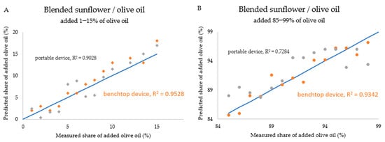 Measured vs. predicted shares of added olive oil in the sunflower oil, based on NIR scans of the benchtop NIR device and the portable one for blended sunflower oils with 1–15% olive oil (A) and 85–99% (B).