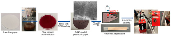 As many plasmonic materials have been developed to maximize two enhancement factors, where electromagnetic enhancement (EM) dominates over chemical enhancement (CE), for SERS applications [19,20,21], paper-based plasmonic substrates could be at the forefront due to their simplicity, affordability, and high-throughput capability. Thus, utilizing a unique plasmonic paper substrate with a high uptake capability of target analytes can improve the entire performance of this combined instrumental method and overcome some limitations associated with typical Raman-based analysis and other single-method approaches. Although combined analyses on shared instrumental platforms have shown promising outcomes for sensitive and selective detection [17,18], there is still room for improvement in the sensing capability by fabricating proper sample treatment methods on plasmonic substrates, allowing for the development of rapid and precise analytical processes.