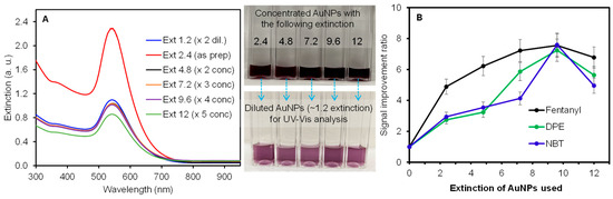 Based on previous work [23,31,32], the plasmonic papers prepared with AuNPs possessing an extinction of 2.4 were determined to be ideal for inducing effective plasmonic coupling to maximize SERS enhancement. Thus, the prepared AuNP-loaded plasmonic paper was tested as a single sampling substrate for SERS and PSI-MS, to serve as the initial reference point. To further promote the SERS effect, all analytes were mixed with additional AuNPs before depositing them on the plasmonic paper. As we speculated that the degree of local aggregation and close proximity of analytes to plasmonic materials could be strongly dependent on the concentration of plasmonic NPs, a series of AuNP solutions possessing the extinction of 2.4, 4.8, 7.2, 9.6, and 12, obtained by centrifugation, were mixed with the illicit drug analytes (1:1 v/v ratio). It is noted that the extinction band (i.e., SPR) of the concentrated solutions after an equal dilution was mostly comparable, except for the AuNPs with an extinction of 12 (Figure 3A). This slightly lower intensity suggested the inevitable loss of AuNPs or the presence of partial aggregation during the centrifugation and concentration of the solution.