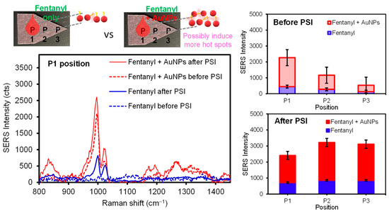 Representative SERS spectra of fentanyl and a mixture of fentanyl and AuNPs and their average signal intensities at several paper positions before and after PSI.