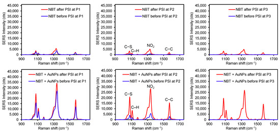 Representative SERS spectra of NBT (top) and a mixture of NBT and AuNPs (bottom) before and after PSI at three different spots on the plasmonic sample substrate (P1 for the original sample spot and P2 for in between P1 and P3, and P3 for the tip of the substrate).