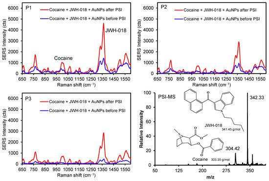 Furthermore, the illicit drugs cocaine and JWH-018 (a synthetic cannabinoid) were mixed with AuNPs to demonstrate the possibility of discriminating between two different analytes before and after the PSI pretreatment (Figure 6 and Figure S8). Several peaks for JWH-018 at 1364 cm−1 (νC=C) and 768 cm−1 (ring breathing) were detectably higher than those of the cocaine peak at 1010 cm−1 (νC-C in the aromatic ring) [42,43]. As these drug molecules possess weak interfacial interactions with the surface of AuNPs, the diffusion process promptly allowed for their physical adsorption across the plasmonic paper, which was confirmed by the SERS intensity variations (e.g., P1 to P3) before PSI. The subsequent PSI treatment readily increased the SERS signals for both compounds (at least ~3–4 times at P1 and P2, and ~8 times at P3). The degree of peak enhancements for the mixture was far greater than that for individual drugs, which could be caused by matrix effects and/or the presence of common molecular backbones (i.e., the overlap of vibrational energy levels) [1,44,45,46]. As observed above, the homogeneity of the signals improved again throughout the substrate after the PSI treatment. Specifically, the initial intensity variations between P1 and P3 were ~3 and ~4 times for cocaine and JWH-018, respectively. After the PSI treatment, the variations in SERS intensity were significantly reduced for cocaine (~1.5 times) and JWH-018 (~1.6 times). Separately, the relative abundance of mass spectra for JWH-018 was higher than cocaine, possibly associated with the ionization efficiency under our PSI-MS conditions. This mixed analyte analysis also suggested the possibility of improving the identification capability of our system by utilizing plasmonic AuNPs and PSI treatment. Along with fabricating a multi-purpose plasmonic paper, developing an effective sample handling method can still improve the overall sensitivity and selectivity of both PSI-MS and SERS analyses.