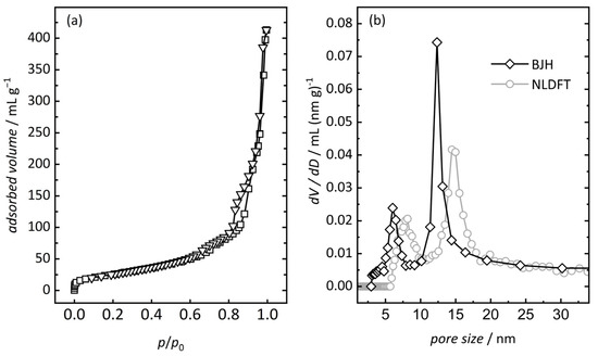 Material characterization: N2 physisorption measurements were conducted at −196 °C after degassing the samples at 120 °C for 12 h in a vacuum using an Autosorb 6 (Quantachrome Instruments, Boca Raton, FL, USA). Surface areas were calculated using the Brunauer–Emmet–Teller (BET [56]) approach in a relative pressure region of 0.1–0.3, meeting the Rouquerol requirements [57]. Pore size distributions were calculated from the desorption branch, utilizing the Barrett–Joyner–Halenda model [58] as well as non-local density functional theory (NLDFT) kernel for cylindrical silica pores. The total pore volume was calculated at the penultimate adsorption point.