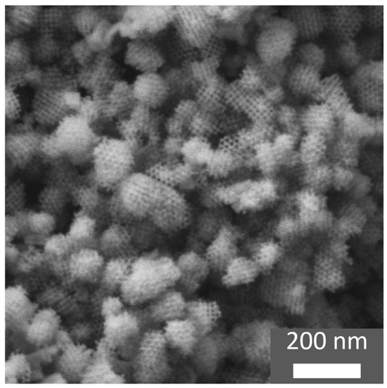 The In2O3 particles exhibit a spherical shape with an average particle size of around 95 ± 5 nm (Figure 3), and the cubic pore structure is clearly visible. The atomic ratio of In to O is 0.59 ± 0.08: 1 which, with respect to the error of the measurement, resembles In2O3. The remaining silica content is around 3.4 ± 0.94 wt.%, which might be one reason for the atomic ratio of In to O showing a slight excess of oxygen. The synthesized In2O3 exhibits a direct bandgap of 3.83 ± 0.002 eV (see Figure S3).