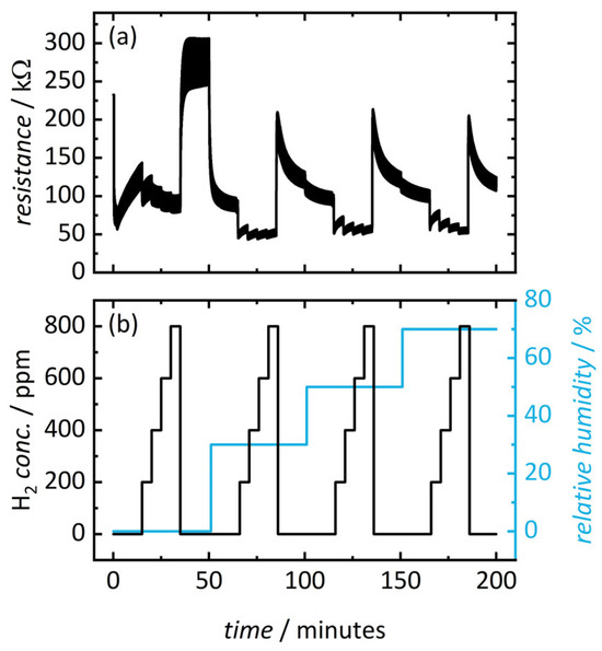 (a) Resistance of mesoporous In2O3 measured at 150 °C upon exposure (b) to hydrogen (0 ppm, 200 ppm, 400 ppm, 600 ppm, and 800 ppm) and relative humidity (0%, 30%, 50%, and 70%). Duration of illumination is 5 s, followed by no illumination for 5 s. Illumination cycling is repeated throughout the entire measurement.