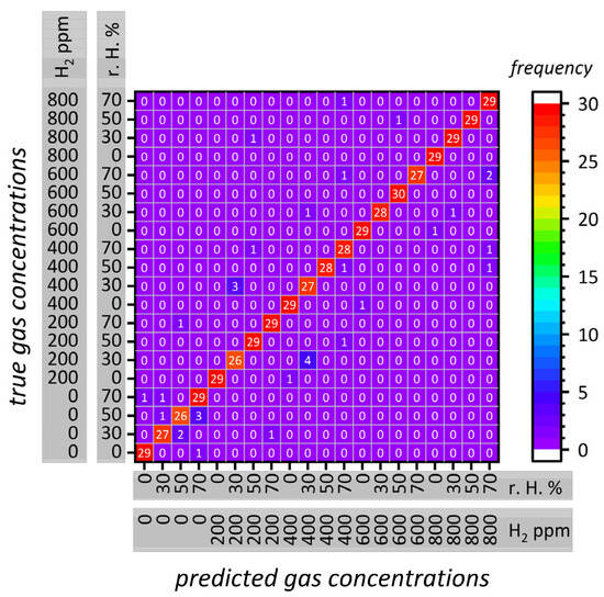 The gas sensor was exposed to discrete amounts of hydrogen (five concentrations: 0 ppm, 200 ppm, 400 ppm, 600 ppm, and 800 ppm) and relative humidity (four concentrations: 0%, 30%, 50%, and 70%) and the changes in the electronic resistance upon gas and light exposure (full cycle for a total of 10 s with a resistance measurement frequency of 10 Hz) were used for learning and evaluation of the classes. No gas concentrations between the aforementioned classes were added or evaluated, so we chose a classification algorithm. The actual concentrations (i.e., classes) versus the classification made by the machine learning algorithm are depicted in a confusion matrix in Figure 6. Cycles located on the diagonal (from bottom left to top right) are correctly classified sets, while deviations from the diagonal are wrongly associated. The best sensor (out of five) exhibits a correct classification of 92.0%, which is comparable to the literature values (see Table 2).