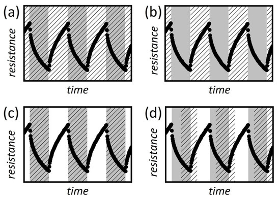Data chosen from Figure 5 utilized for classification (white area LED on, gray area LED off, and hatched area shows data utilized for machine learning), (a) full cycle, (b) illumination cycle, (c) darkness cycle, (d) 2.5 s of darkness followed by 2.5 s of illumination. Illumination and darkness periods are set to 5 s each.
