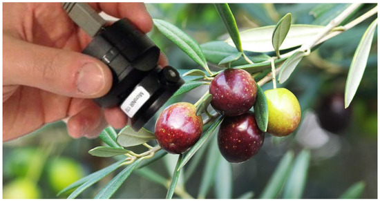 With the aim of calibrating the spectral response, a specific experimental design was selected, taking into account different variables that may influence ripening of olives, such as the age of the plant and the exposure to sun. Spectra were collected directly, bringing the instrument close to the olives as depicted in Figure 1.