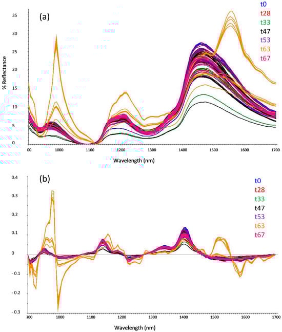 Sample Leccino (6). Collected MicroNIR spectra (a) and 1st derivative signals (b) of olives as a function of the ripening time: starting day 0 (blue) and after 28 (red), 33 (green), 47 (black), 53 (purple), 63 (orange) and 67 (pink) days since the first collection.