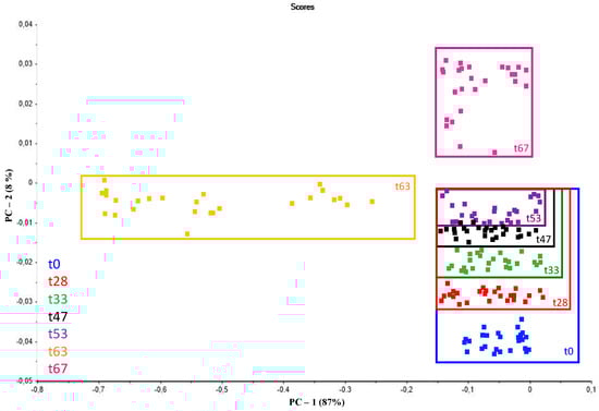 Plot of resulting scores by PCA of spectra from olives at time 0 (blue) and after 28 (red), 33 (green), 47 (black), 53 (purple), 63 (orange) and 67 (pink) days since the first collection.