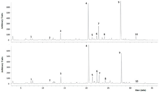 Chromatographic evidence of the ripening-induced modifications of phenol concentrations, using sample “Leccino 6” as an example. Chromatographic conditions were as reported in reference [49]. Peak legend: 1 = hydroxytyrosol; 2 = chlorogenic acid; 3 = syringic acid; 4 = dimethyloleuropein; 5 = rutin; 6 = luteolin; 7 = verbascoside; 8 = nuzheride; 9 = oleuropein; 10 = ligstroside.