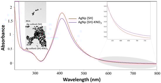 UV absorption spectra of Ag colloid (AgH) and Ag colloid (AgH)-KNO3. Inset: TEM images of Ag colloid (AgH) and Ag colloid (AgH)-KNO3.