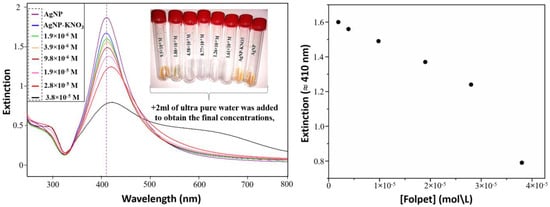 Extinction spectra of Ag colloid in the absence and presence of folpet from 3.8 × 10−5 to 1.9 × 10−6 M. Variation in the extinction intensity of the band (peak intensity) with a maximum at 410 nm.