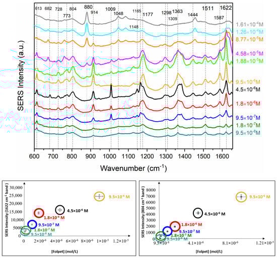 The samples for the SERS analysis were prepared by adding different aliquots of initial folpet 10−3, 10−4, and 10−5 M stock ethanol solutions to 500 µL of the AgH colloid, to which 20 µL of 0.5 M KNO3 were previously added to activate the suspension. By this method, the following final concentrations of folpet were prepared: 1.61 × 10−4, 1.26 × 10−4, 8.77 × 10–5, 4.58 × 10−5, 1.88 × 10−5, 9.5 × 10−6. 4.5 × 10−6, 1.8 × 10−6, 9.5 × 10−7, 1.8 × 10−7, and 9.5 × 10−8 M.