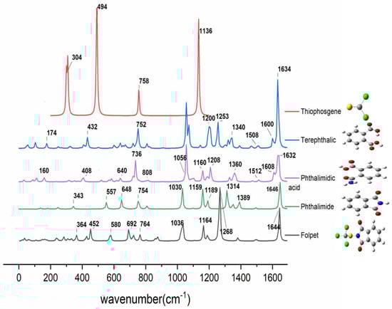 (Left): DFT-calculated Raman spectra of folpet and different candidate-degraded molecules. (Right): The optimized structures using the DFT-B3LYP/6-311++G(d,p) basis set.