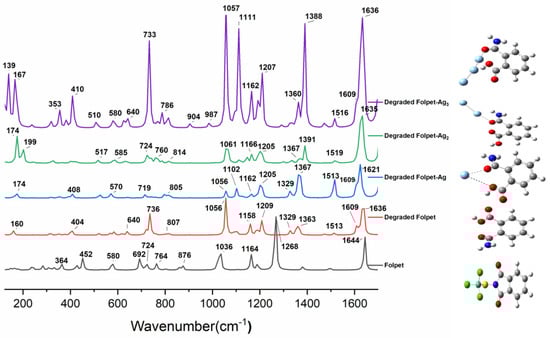 (Left): The calculated spectra of folpet, degraded folpet, and degraded folpet-Agn (n = 1–3) complexes. (Right): The optimized structures. The term “degraded” refers to folpet N–S bond cleavage.