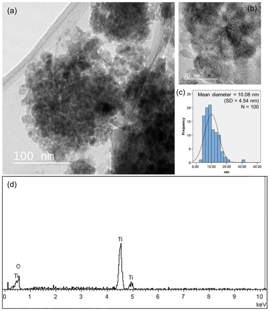 A TEM image of the TiO2 obtained is shown in Figure 2a. The presence of abundant nanoparticles with spherical morphology can be observed, indicating that the synthesis leads to a high yield of nanomaterial. Figure 2b shows a higher magnification micrograph, in which the spherical morphology can be better defined. The frequency histogram with the size distribution curve is shown in Figure 2c, where it can be observed that the nanoparticles have a low size dispersion. The diameter range is comparable to that previously obtained by Olcay et al. [23], which extended from 5 to 35 nm. The mean diameter of the nanoparticles obtained in our work is 10.08 nm (SD = 4.54 nm). Figure 2d shows the EDS spectrum of the prepared nanomaterial, where peaks associated with titanium and oxygen are observed, corresponding to TiO2. No peaks associated with other major elements are observed, indicating that a high-purity material was synthesized.