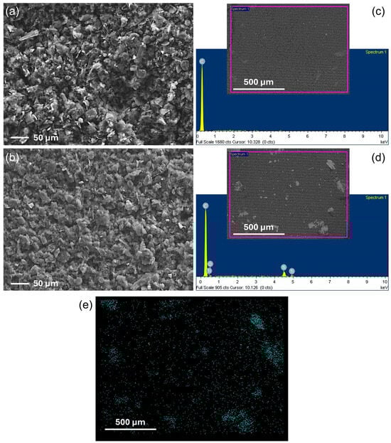 SEM secondary electron micrograph: (a) CPE surface, (b) TiO2/CPE surface. SEM backscattered electron micrograph and EDS spectrum: (c) CPE surface, (d) TiO2/CPE surface; and (e) EDS mapping of a TiO2/CPE surface section.