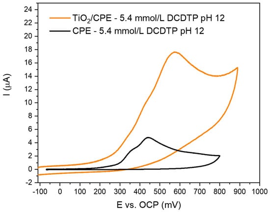 Cyclic voltammograms of a 5.4 mmol/L DCDTP solution at pH 12.0 using the CPE and the TiO2/CPE. Supporting electrolyte: 0.1 mol/L phosphate buffer and 0.1 mol/L KNO3. Scan rate: 50 mV/s.