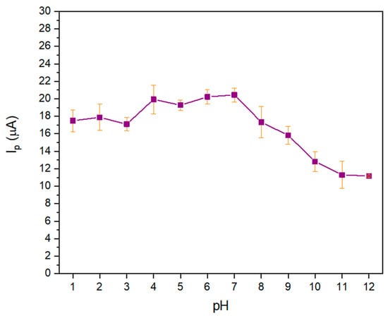 The electrochemical response to 5.4 mmol/L sodium dicresyl dithiophosphate (DCDTP) was investigated using the carbon paste electrodes with and without modification with the nanomaterial. Cyclic voltammograms were recorded from 0 to 1000 mV vs. OCP at a scan rate of 50 mV/s. The sensor response to DCDTP was studied for different pH values from 1.0 to 12.0 to select the highest peak current. This was performed to maximize the electroanalytical response to develop the quantitative voltammetric method using the electrochemical sensor.
