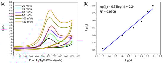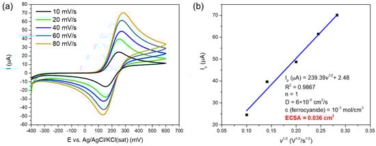 Figure 7a shows the cyclic voltammograms for a 10 mmol/L potassium ferrocyanide solution at different scan rates. An increase in the anodic and cathodic peak currents is observed with an increasing scan rate. Figure 7b shows the linear relationship between the peak current and the square root of the scan rate according to the Randles-Ševčík equation. This plot allowed the ECSA to be determined from the slope, which was found to be 0.036 cm2. This area is larger than that obtained by the same procedure for the unmodified CPE, which was 0.026 cm2. This indicates that the TiO2 nanoparticles cause an increase in the electroactive area of the electrode. Nanoparticles, in general, are known to have a high surface area, including those synthesized by green methods [36].