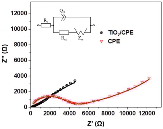 Figure 8 shows Nyquist plots resulting from the EIS studies for both the CPE and TiO2/CPE. Within the graph, the equivalent circuit has been drawn, the modeling of which is shown as a continuous line. The circuit consisted of the electrolyte resistance (Rs) in series with a parallel combination of a constant phase element (Qdl), generally associated with the capacitance of the electrical double layer, and the charge transfer resistance (Rct). In addition, a Warburg element (ZW) was included in the faradic branch of the circuit, which represented the resistance to mass transfer. The use of a constant phase element instead of a pure capacitor is since, in the former case, non-ideal effects such as electrode surface roughness are taken into account [38,39]. Figure 8 shows a high degree of agreement between the experimental and simulated data for both electrodes.