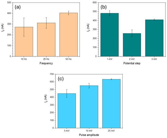 Optimization of the peak current intensity for dithiophosphate by square wave voltammetry: (a) Effect of the pulse frequency keeping the potential step at 1 mV and the pulse amplitude at 5 mV, (b) effect of the potential step keeping the frequency at 50 Hz and the pulse amplitude at 5 mV, and (c) effect of the pulse amplitude keeping the frequency at 50 Hz and the potential step at 1 mV.