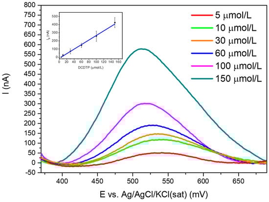 Figure 10 shows the square wave voltammograms in the range of 5 to 150 μmol/L, where the peak current increases with increasing concentration of DCDTP. The inset shows the calibration curve (Ip = 2.80 × [DCDTP] − 12.76), with an R2 of 0.9939, which is acceptable for an electroanalytical method. The p-value of the ANOVA for this curve is 1.41 × 10−5, well below the 0.05 significance level, indicating that the calibration is statistically significant at 95% confidence.