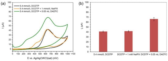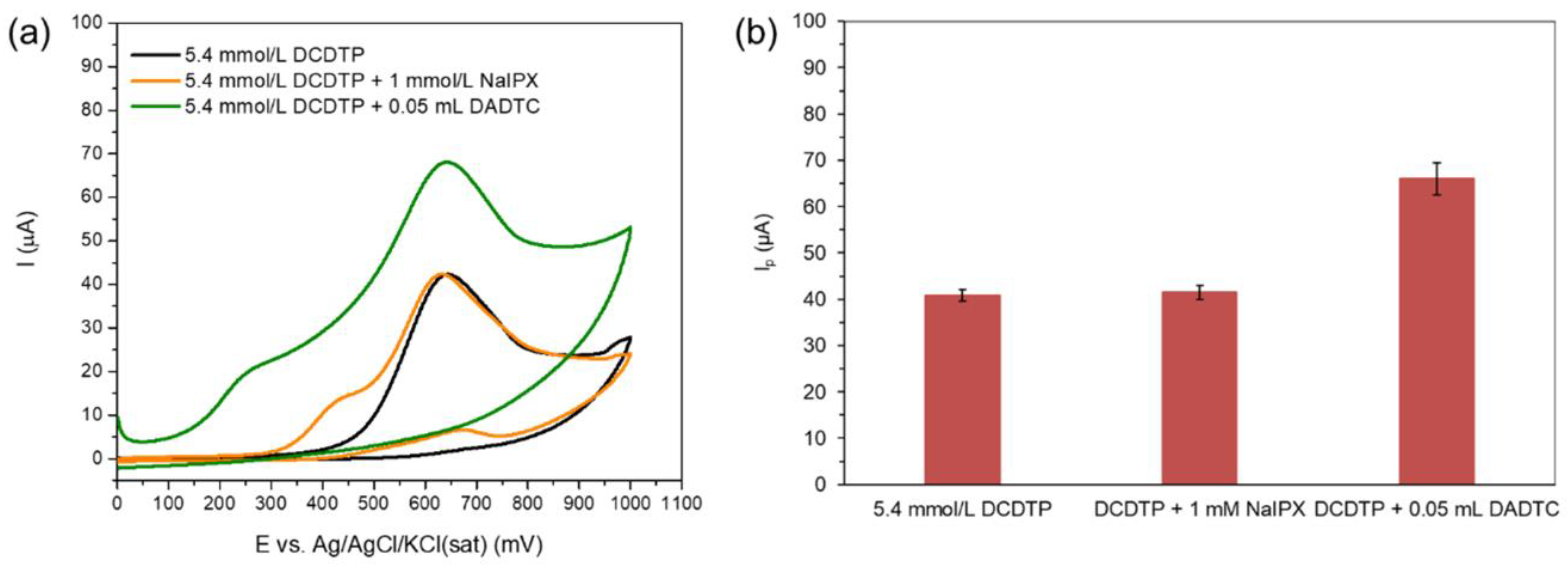 (a) Cyclic voltammograms for three solutions containing 5.4 mmol/L DCDTP, 5.4 mmol/L DCDTP + 1 mmol/L NaIPX, and 5.4 mmol/L DCDTP + 0.05 mL DADTC, respectively (supporting electrolyte: 0.1 mol/L phosphate buffer and 0.1 mol/L KNO3, pH 7.0. Scan rate: 100 mV/s), (b) Plot of the peak current intensity versus the solution composition.