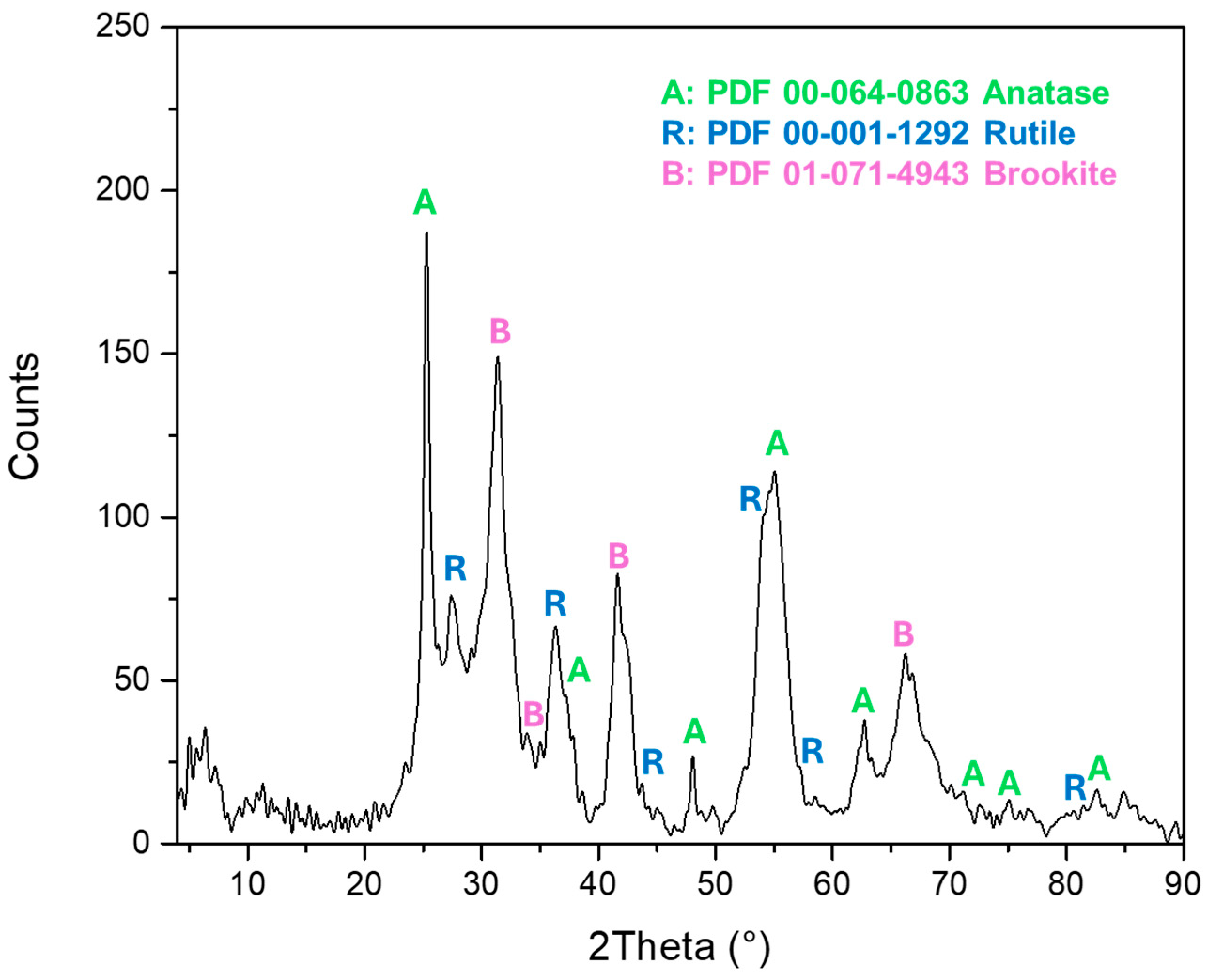The X-ray diffractogram of the TiO2 obtained in this work is shown in Figure 1. The three most common crystalline phases of titania are identified, namely anatase, rutile, and brookite. It has been found that rutile can provide a higher surface area, while anatase has a better bulk transport of excitons to the surface, leading to a higher catalytic efficiency [31,32]. Although studies explaining the difference in catalytic efficiency have focused on the photocatalytic effect, all evidence suggests that the polymorphic composition may be favorable [33], which can be confirmed in Figure S1 for the case of the electrochemical oxidation of DCDTP, where the peak current intensity was higher for the nanoparticles obtained in this work compared to anatase phase TiO2 of similar size obtained according to a sol-gel method with heat treatment reported by Bagheri et al. [25]. The higher electrochemical response with the polymorphic material avoids the prolonged heat treatment of at least 5 h for crystalline phase transformation, which contributes to the green nature of the method by saving energy consumption. The broad peaks in the diffractogram indicate that while the nanomaterial is predominantly crystalline, there is some amorphous content.