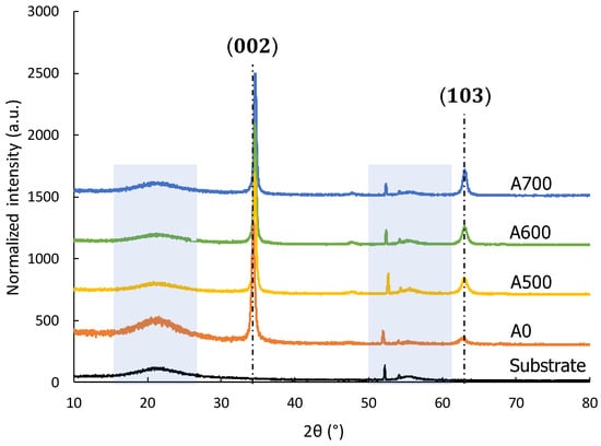 The GZO samples exhibit only two peaks associated with the (002) and (103) planes of the ZnO structure. In reference ZnO crystallographic data [], the intensities of the (002) and (103) peaks are the 3rd and 5th most intense peaks in the diffractogram, and the intensity ratio between these two peaks is 63%. However, no other diffraction peak is visible, and the highest ratio I(103)/I(002) measured is 22% for A700. This is the sign of an oriented structure of the thin film along the (002) planes. This is consistent with literature for ZnO thin films grown with RF magnetron sputtering [,].