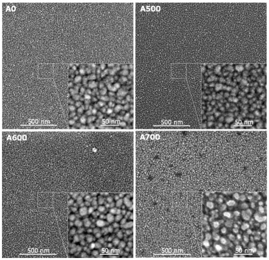 SEM observations of the surface of the films are available in Figure 4. It reveals an equiaxed microstructure. The average grain size of each film has been measured from these images and is presented in Table 4. No significant evolution of the grain size has been observed after annealing; the average value for all films is in between 14 nm and 16 nm. A slight texture change can be noted for A700. These observations are also consistent with what is reported in the literature for ZnO thin films [,].