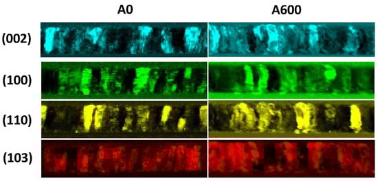 TEM observations of the A0 and A600 samples are presented in Figure 5. The TEM blade thickness being around 100 nm thick and the grain around 15 nm large, the electron beam goes through more than seven different grains on average, making the images difficult to analyze. A columnar microstructure is expected [,,] but difficult to identify in these TEM images.
