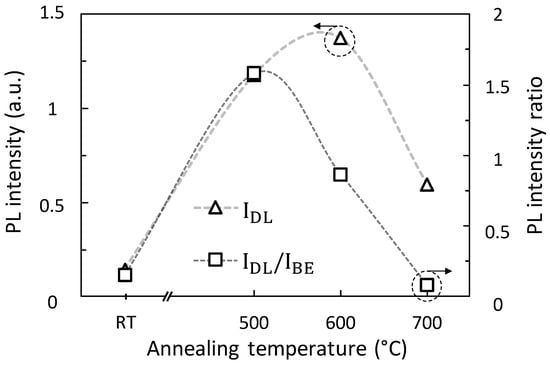 PL intensity ratio and sum of the DL lines’ intensity as a function of the annealing temperature.