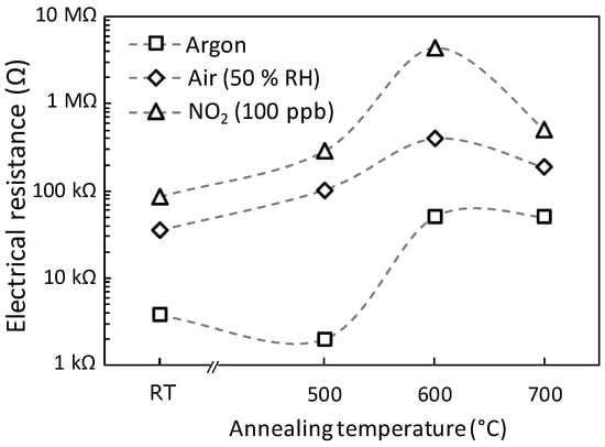 The electrical resistance of the thin films has been measured under neutral argon atmosphere, humid air as reference atmosphere, and reference atmosphere polluted by 100 ppb of NO2. All measurements were made at 250 °C after 12 h of stabilization. The results are presented in Figure 10.